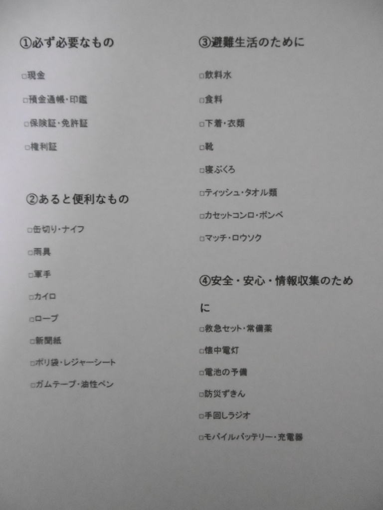 非常時持ち出しグッズのリストを一覧にして印刷し